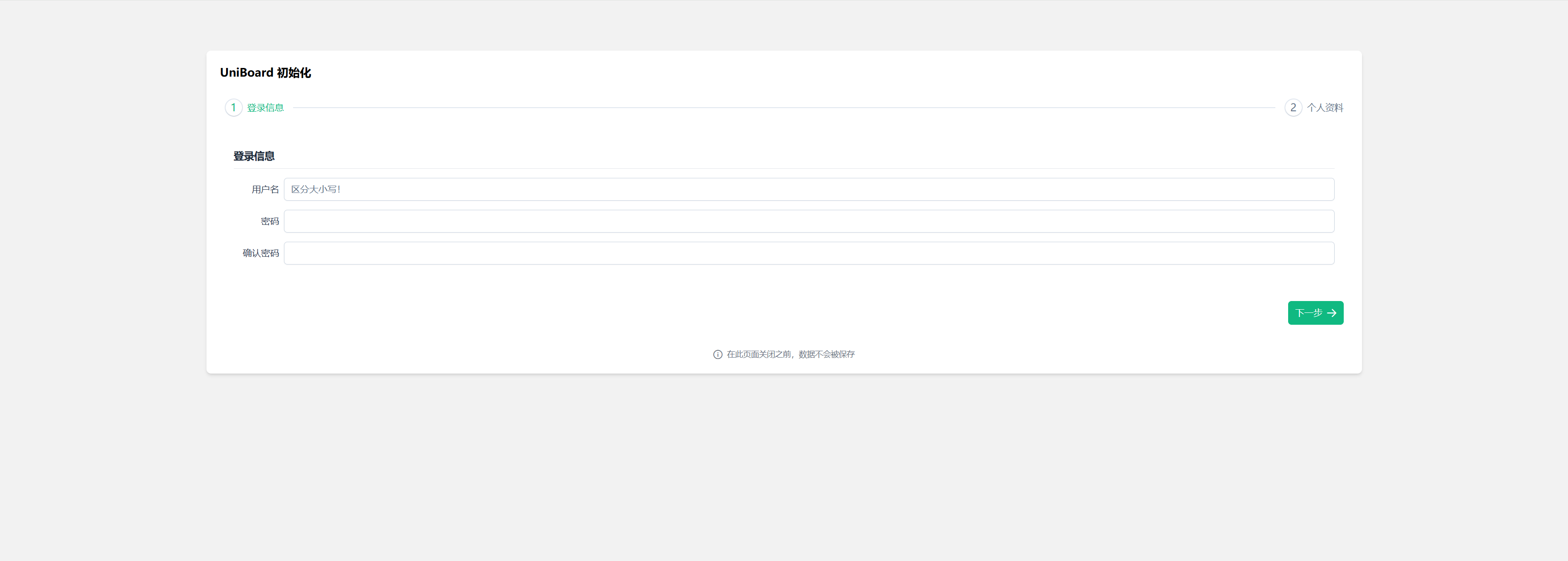 初始化完成后,你就可以通过 https://域名 来访问 UniBoard 了。使用你刚刚创建的用户名/密码登录。 登录方式有些许特别,见下图。